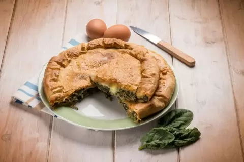 Паскуалина отличается от привычных куличей и представляет собой слоеную выпечку с весенними травами. Чаще всего используются шпинат, мангольд, артишоки и, конечно, запеченные яйца, которые в итоге предстают удивительным зрелищем, когда пирог разрезают и яйца показываются на поверхности.