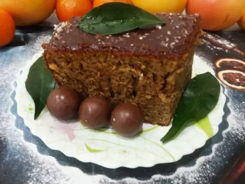 Покрывают пирог ещё теплой глазурью и посыпают орехами. Дают настояться в холодильнике около часа для полного застывания глазури.
