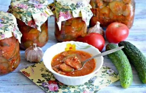 Для этого салата понадобятся: 3 кг свежих огурцов, 1,5 кг спелых помидоров, 4 сладких и 1 острый перец, 100 г чеснока, а также немного масла, соли и уксуса. Огурцы нарезаются кружочками, овощи пропускаются через мясорубку, а затем смешиваются. После добавления соли и масла салат варят 20 минут, а уксус – за 5 минут до окончания готовки. Разложите по стерильным банкам и закатайте.