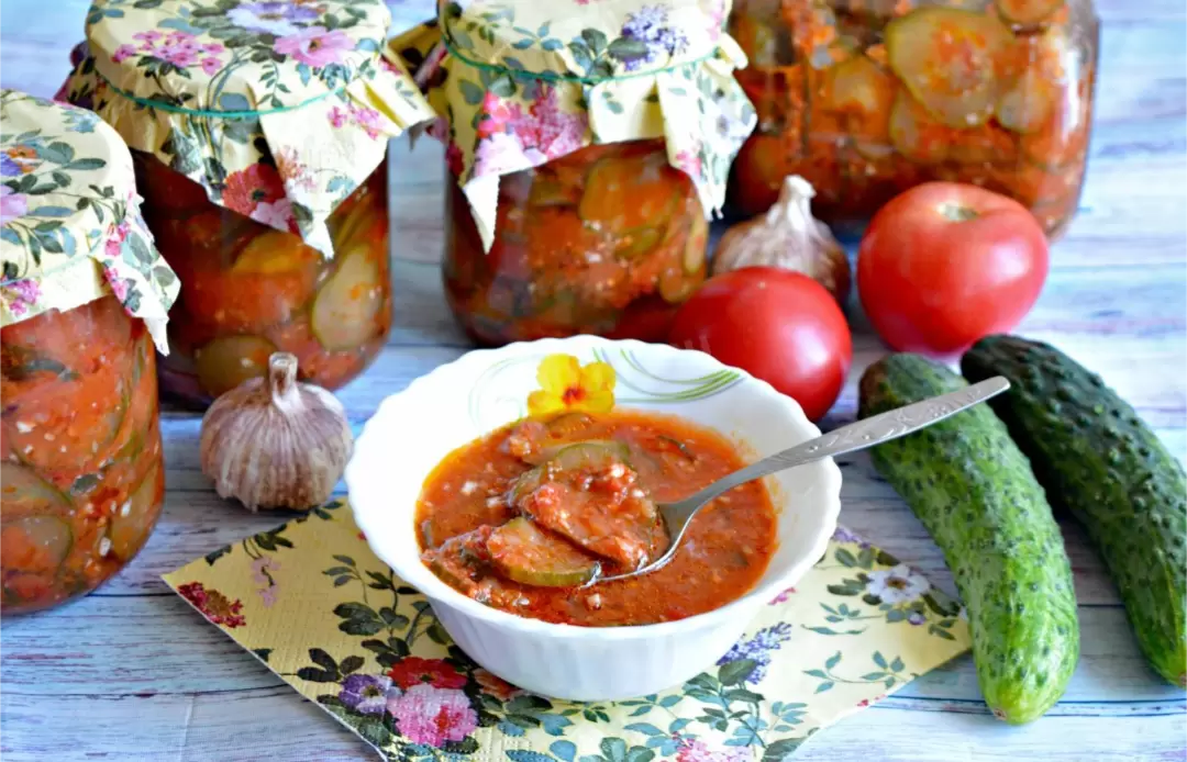 Возьмите 5 кг огурцов (можно и перезревших), 2 кг помидоров и 500 г сладкого перца. Прокрутите помидоры с перцем, добавьте в массу нарезанные кубиками огурцы, сахар и соль. Все это варится всего 5 минут! Чеснок добавляют в конце и еще раз доводят до кипения. Разложите в стерилизованные банки и накройте теплым покрывалом.