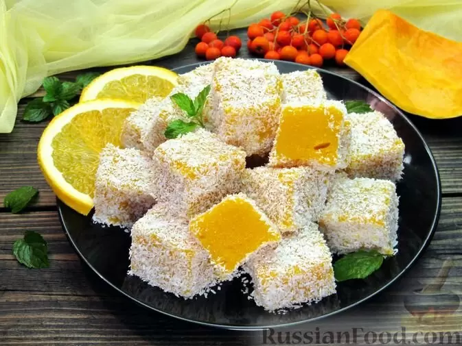 - Тыквенный рахат-лукум с апельсиновым соком и кокосом: Этот десерт поражает своей нежностью. Он обретает особый аромат благодаря апельсиновым нотам, а текстура просто тает во рту. Идеальный вариант для любителей сладостей.