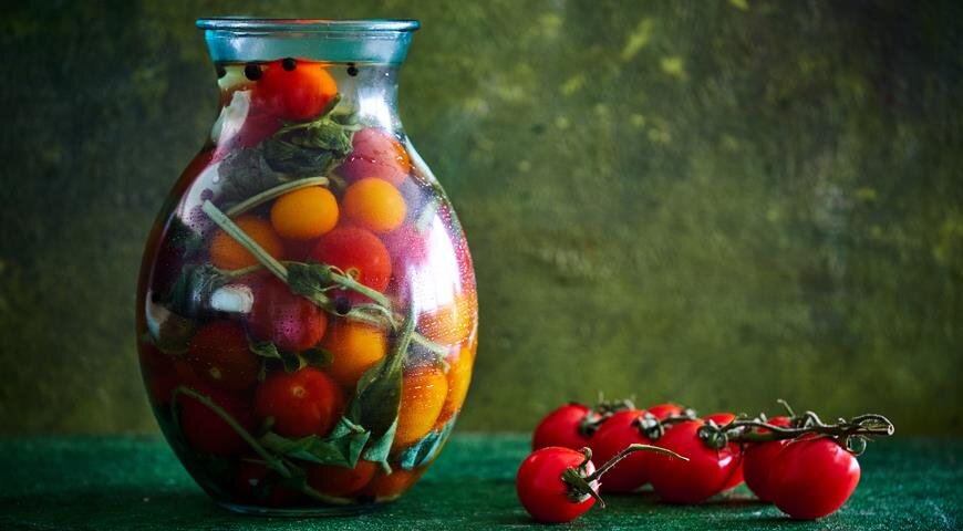 Для консервирования лучше выбрать разноцветные черри, чтобы сделать процесс не только вкусным, но и визуально привлекательным. Эти яркие помидорчики идеально сочетаются с базиликом и прекрасно подойдут как закуска или дополнение к основным блюдам.