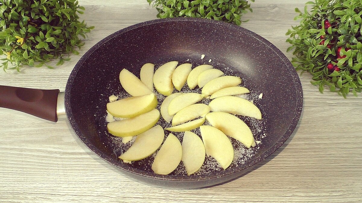 Для начала, сковорода диаметром 26 см смазывается сливочным маслом и посыпается щепоткой сахара. Яблоки необходимо нарезать: их можно порезать не только на дольки, но и кружочками, удалив сердцевину. Специи, например корицу, добавляются по желанию.