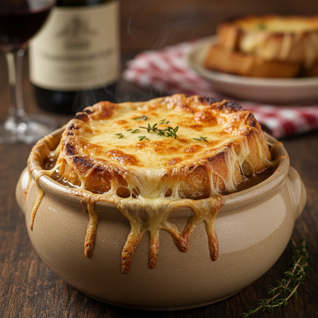 Изначально этот суп был простым деревенским угощением, однако благодаря искусной карамелизации лука, насыщенному вкусу говяжьего бульона и великолепной корочке из поджаренного хлеба с расплавленным сыром Грюйер, он преобразовался в изысканный кулинарный деликатес, который можно встретить в лучших ресторанах по всему миру.